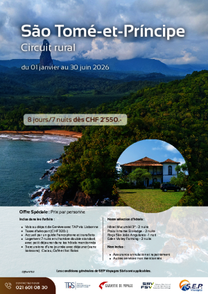 Ce circuit vous permet de découvrir toutes les beautés cachées de l’île de São Tomé. D’unités rurales en unités rurales, prenez contact avec une nature vierge, avec un passé glorieux et avec un peuple au sourire envahissant.