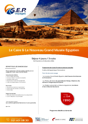 Plongez au cœur de l’une des plus grandes civilisations de l’histoire lors d’un séjour d’exception au Caire avec SEP Voyages. Ce voyage soigneusement conçu vous invite à découvrir l’Égypte pharaonique sous un angle à la fois mythique et résolument contemporain, accompagné d’un guide privé égyptologue francophone qui vous dévoilera les secrets les mieux gardés de ce patrimoine millénaire.