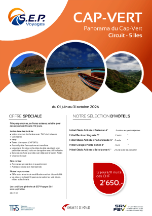 Partez à la découverte des 5 îles du Cap-Vert lors d’un circuit inoubliable alliant plages de sable doré, montagnes verdoyantes et traditions créoles. Vivez un panorama complet de l’archipel grâce à un itinéraire soigneusement conçu, incluant vols, transferts, excursions et une sélection d’hôtels confortables. Entre randonnées à Santo Antão, villes portuaires animées et moments de détente, ce voyage vous promet un dépaysement total au cœur de l’Atlantique.