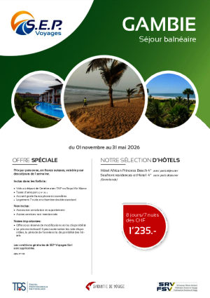SEP Voyages vous propose des séjours balnéaires en Gambie sur des plages à perte de vue. Alliez ces moments de farniente et de détente à l’observation des oiseaux ou encore à la pêche sportive. Dotés d’hôtels de grandes qualités tant au niveau des infrastructures comme du service, la Gambie a tout pour vous proportionner des vacances en toute quiétude.