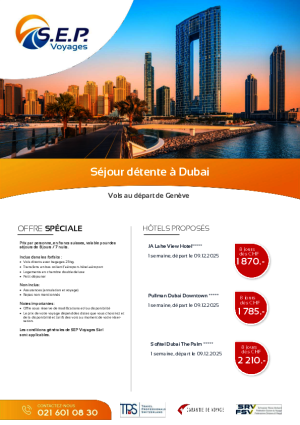 Prix par personne, en francs suisses, valable pour des séjours de 8 jours / 7 nuits.